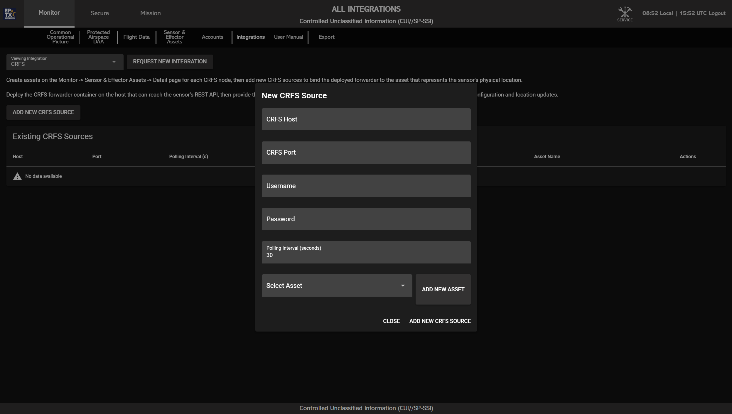 The Ingest CRFS tab allows users to configure and manage inbound data sources from CRFS sensors.